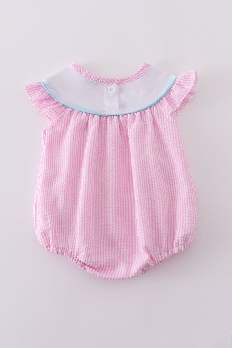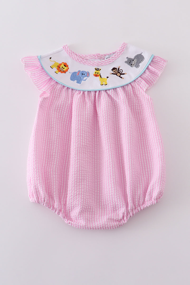 Get ready to be the cutest critter in this pink seersucker bubble with adorable animal embroidery. Made with soft, breathable fabric, this bubble is perfect for any warm weather adventure. Add a playful touch to your little one's wardrobe with this unique and quirky piece! (No animals were harmed in the making of this bubble.)